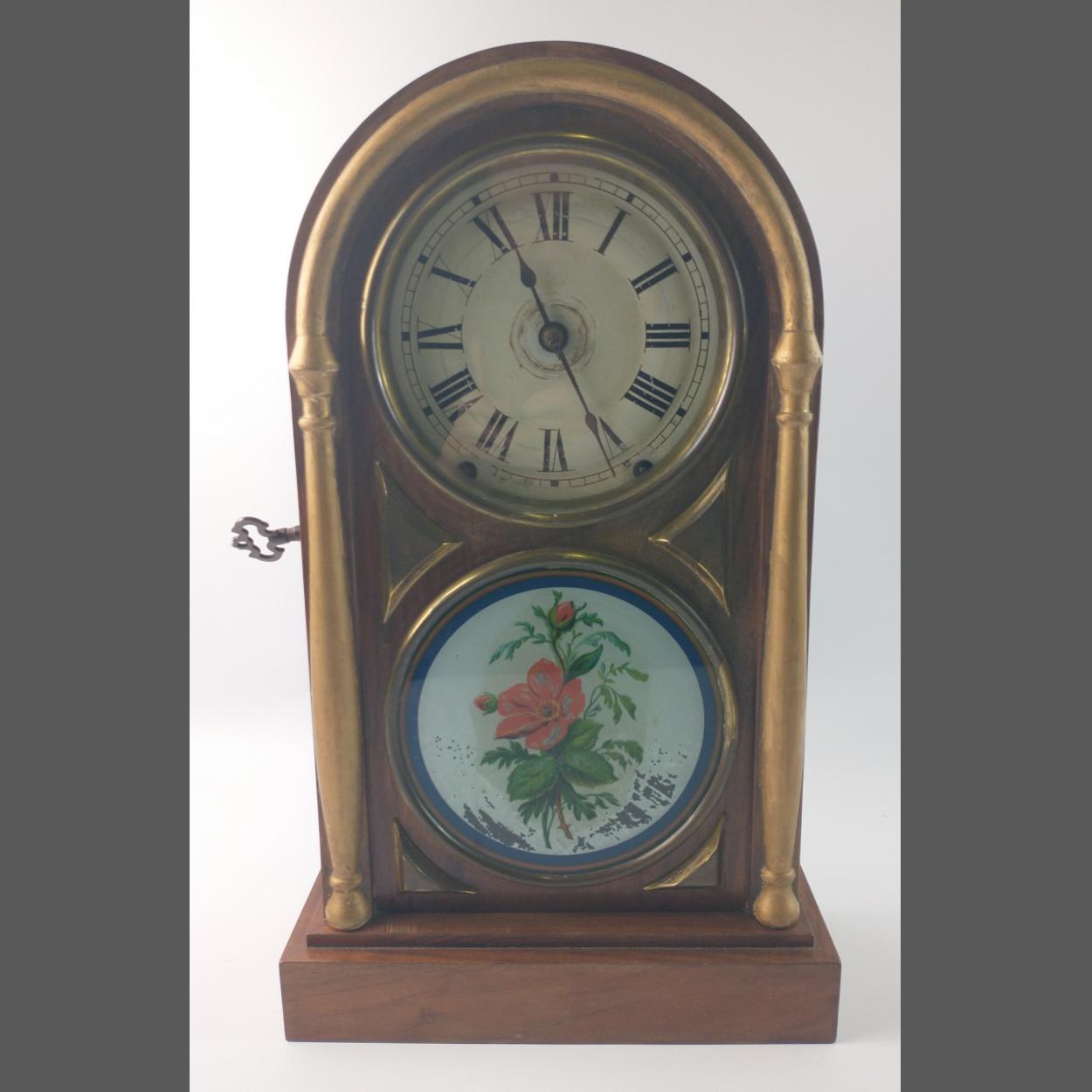 Wooden 8 day spring mantle clock with rounded top, floral panel and Roman numeral dial by Seth Thomas