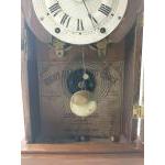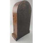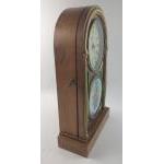 Wooden 8 day spring mantle clock with rounded top, floral panel and Roman numeral dial by Seth Thomas