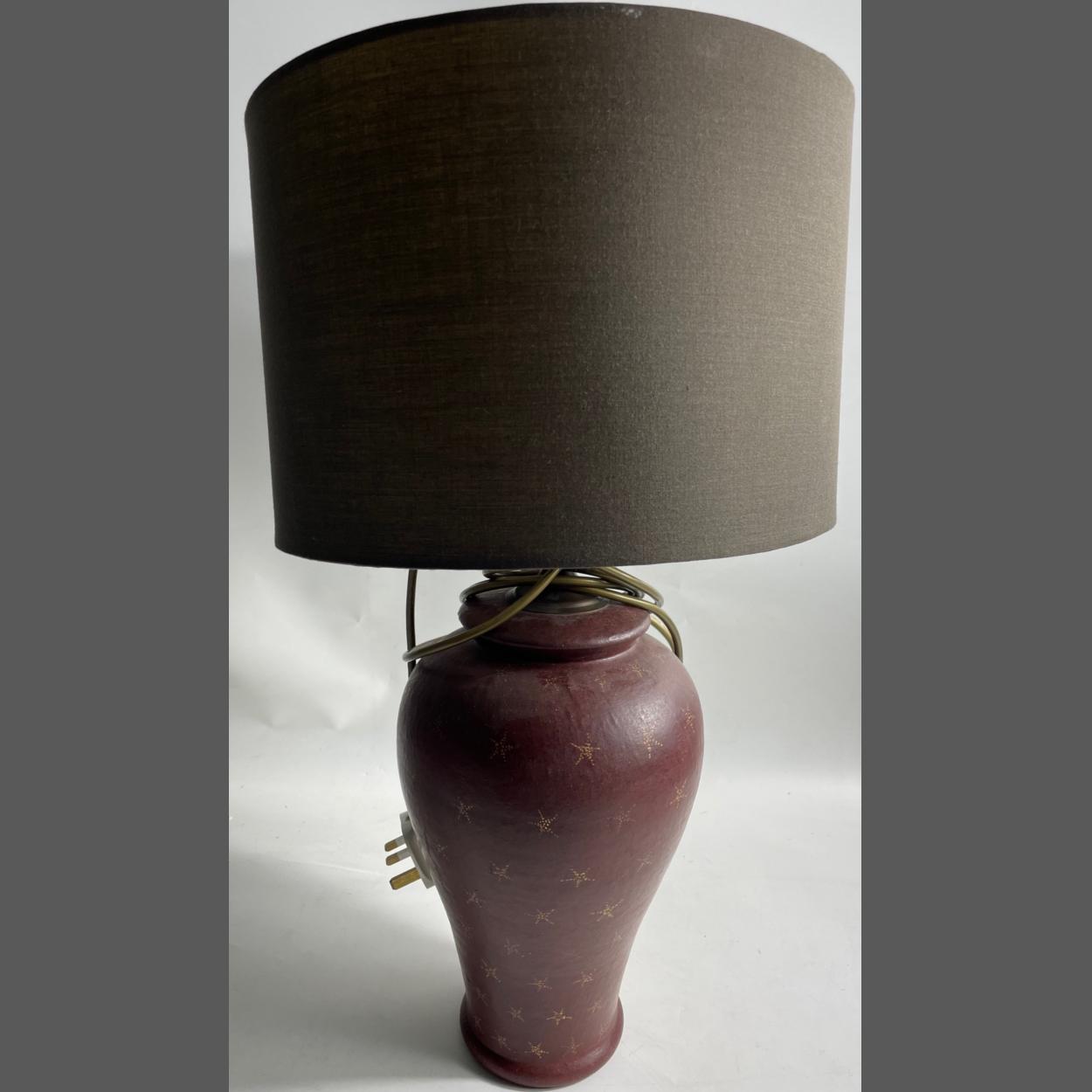 Table lamp in dark red with gold star decoration, stands 57cm tall approx.