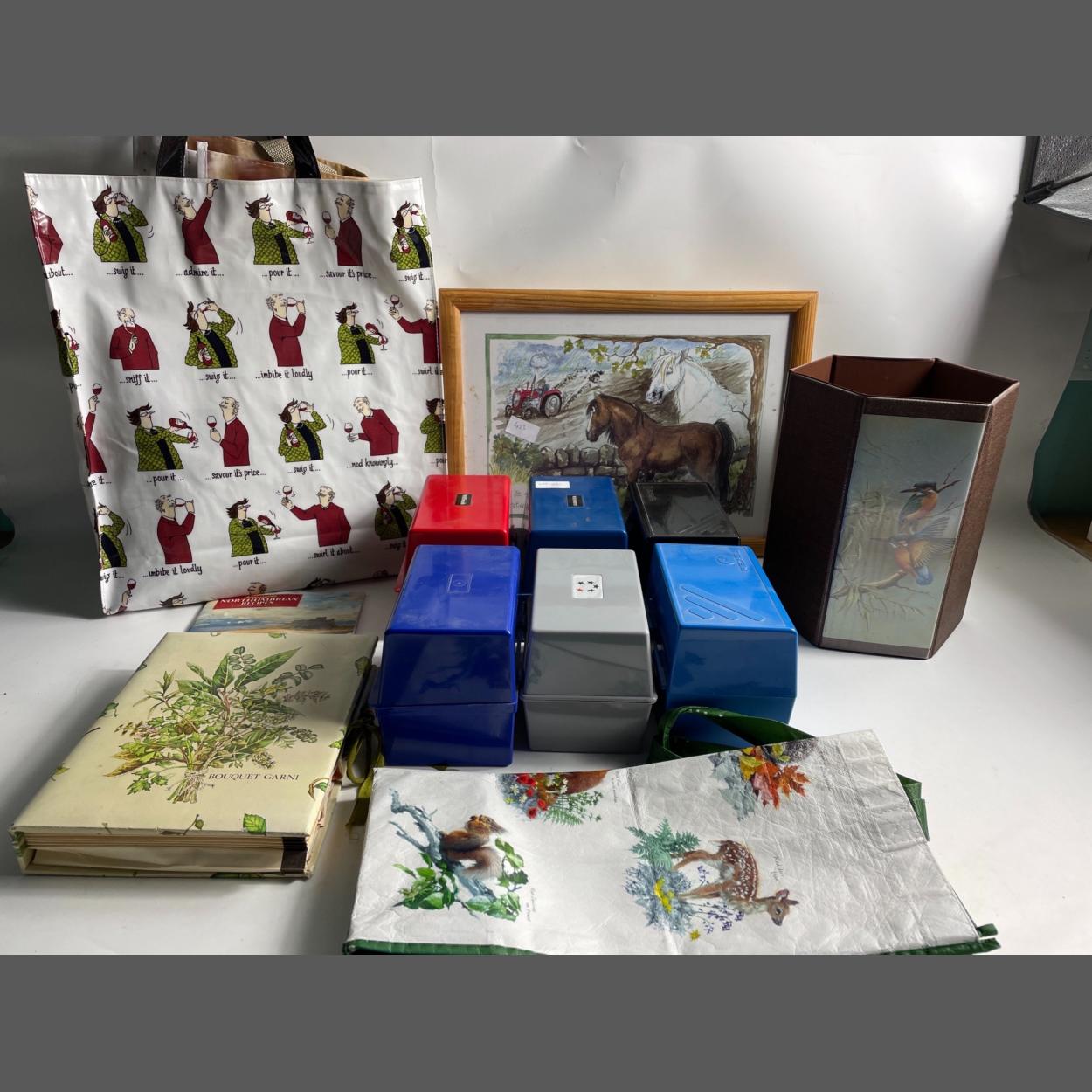 A self-curated collection of recipes on 6 x 4" cards for all sorts of ingredients contained within 6 card index boxes. Never cook the same thing twice again! Plus a laptray with a THELWELL theme and a selection of shopping bags.