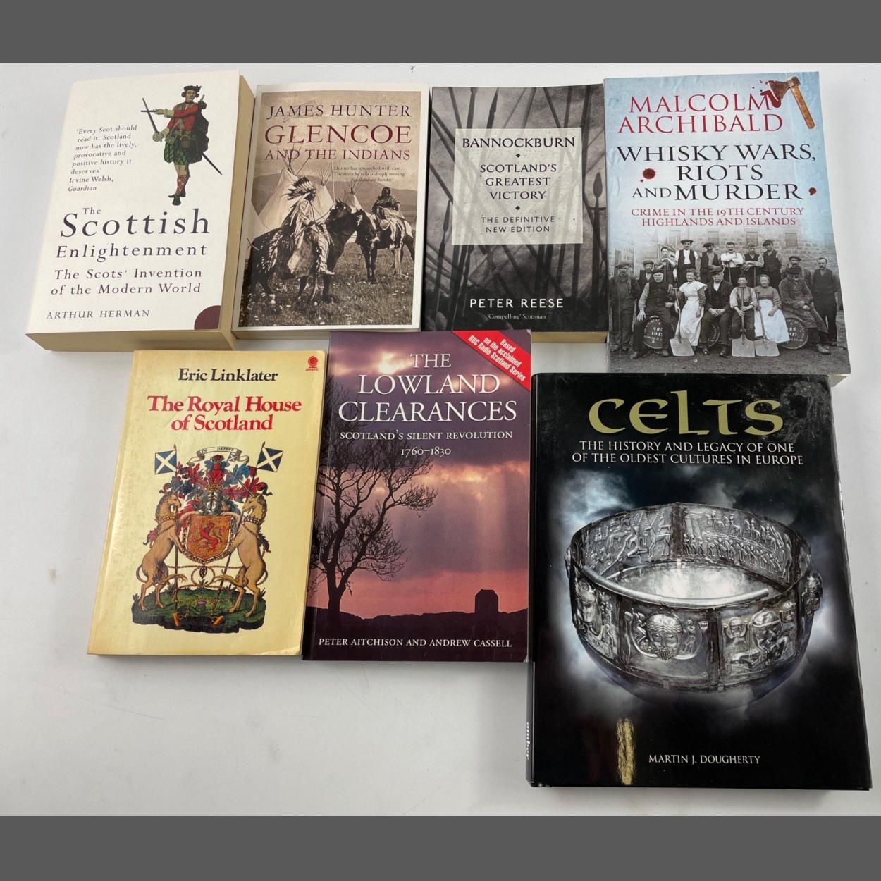 SCOTTISH HISTORY books - to include WHISKY WARS, RIOTS AND MURDER by Malcolm Archibald, GLENCOE AND THE INDIANS by James Hunter, BANNOCKBURN: SCOTLAND'S GREATEST VICTORY by Peter Reese, THE LOWLAND CLEARANCES : SCOTLAND'S SILENT REVOLUTION by Peter Aitchison and Andrew Cassell, THE ROYAL HOUSE OF SCOTLAND by Eric Linklater, CELTS by Martin J Dougherty, THE SCOTTISH ENLIGHTENMENT: THE SCOTS' INVENTION OF THE MODERN WORLD by Arthur Herman