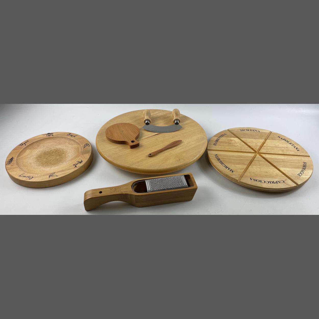 A very nice collection of WOODEN KITCHEN UTENSILS to include a chopping board for herbs complete with chopper, a cheese platter (30cm dia), a pizza chopping board (30cm), a lazy Susan (36cm) as well as a small WORLD OF FLAVOURS grater with container etc - A SMALL FORTUNE££ IN THIS LOT!!