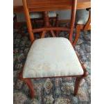 A nice wee yew wood veneer extendable dining table and four chairs with fabric seat pads