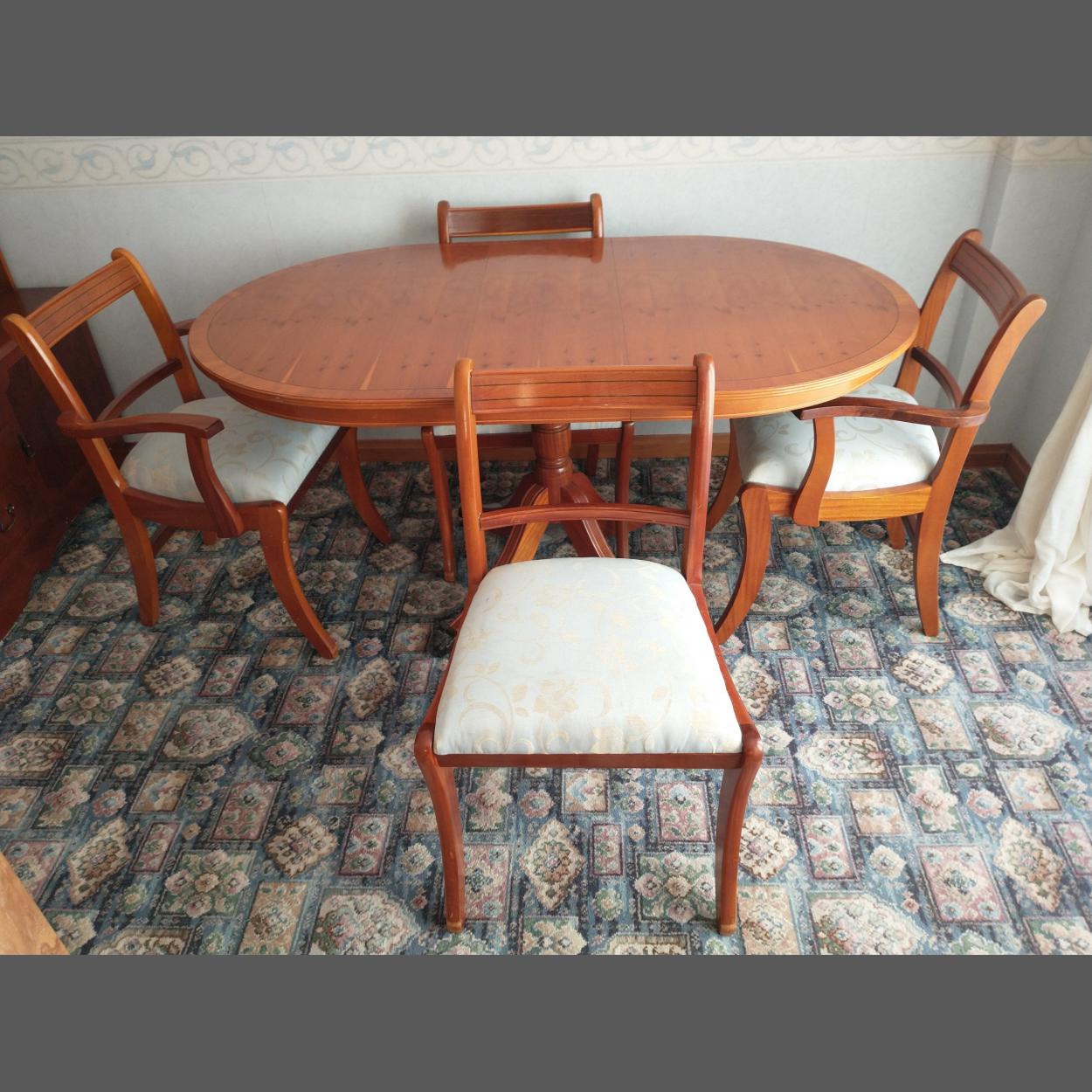 A nice wee yew wood veneer extendable dining table and four chairs with fabric seat pads
