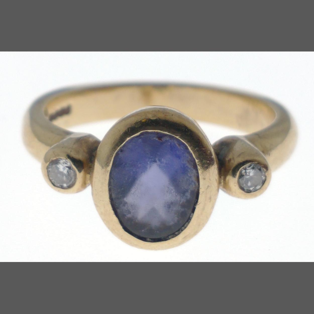 A SUBSTANTIAL (handmade from DUNBLANE, SCOTLAND) 375 stamped yellow gold ladies dress ring with a large blue stone flanked by one diamond (tested)and one white stone size N weight gross 4.75g
