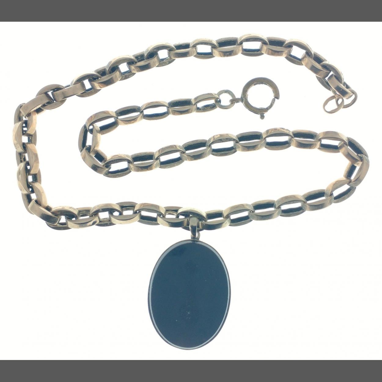 A VINTAGE large link 'yellow metal' necklace with a large oval mounted in 'yellow metal' purple stone pendant 39g gross weight. Acid tests to 12ct