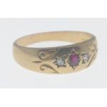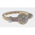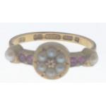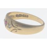625 stamped 15 carat yellow gold dress ring with small garnets and seed pearls insetweight 2.02g ring size N, also a Birmingham Hallmarked 18 stamped yellow gold signet ring with a small garnet and flanked with two small diamonds(tested) ring size N weight 2.65g gross approx