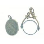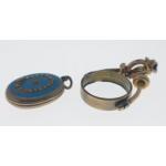 A Victorian 'yellow metal' fob charm with missing stone weight 5.29g approx, a VINTAGE 'yellow metal' photo pendant with blue enamel style and seed pearls inset weight gross 6.15g approx. Both acid test to 12ct