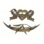Two BEAUTIFUL VICTORIAN seed pearl inset 'yellow metal' brooches, one with a half crescent and flora design 5cm length weight gross 5.30g approx and the other a love heart surrounded with swirly ribbons weight 5.75g gross 3cm length (both test as 12ct)