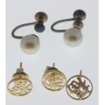 A TASTE OF THE ORIENT!! A 14K stamped yellow gold pair of earrings with green stones inset weight 2.40g gross approx, also a pair of unstamped 'yellow metal' Oriental design stud earrings in love heart form weight 1.45g, with an ORIENTAL part of an earring in 'yellow metal' weight .19g approx, and also another miniature pair of ORIENTAL 'yellow metal' stud earrings weight .66g approx and a part-pin missing brooch head with pinkish stone inset in 'yellow metal' weight gross 2.17g approx and lastly a pair of VINTAGE SILVER stamped pearl earrings gross weight 2.28g approx