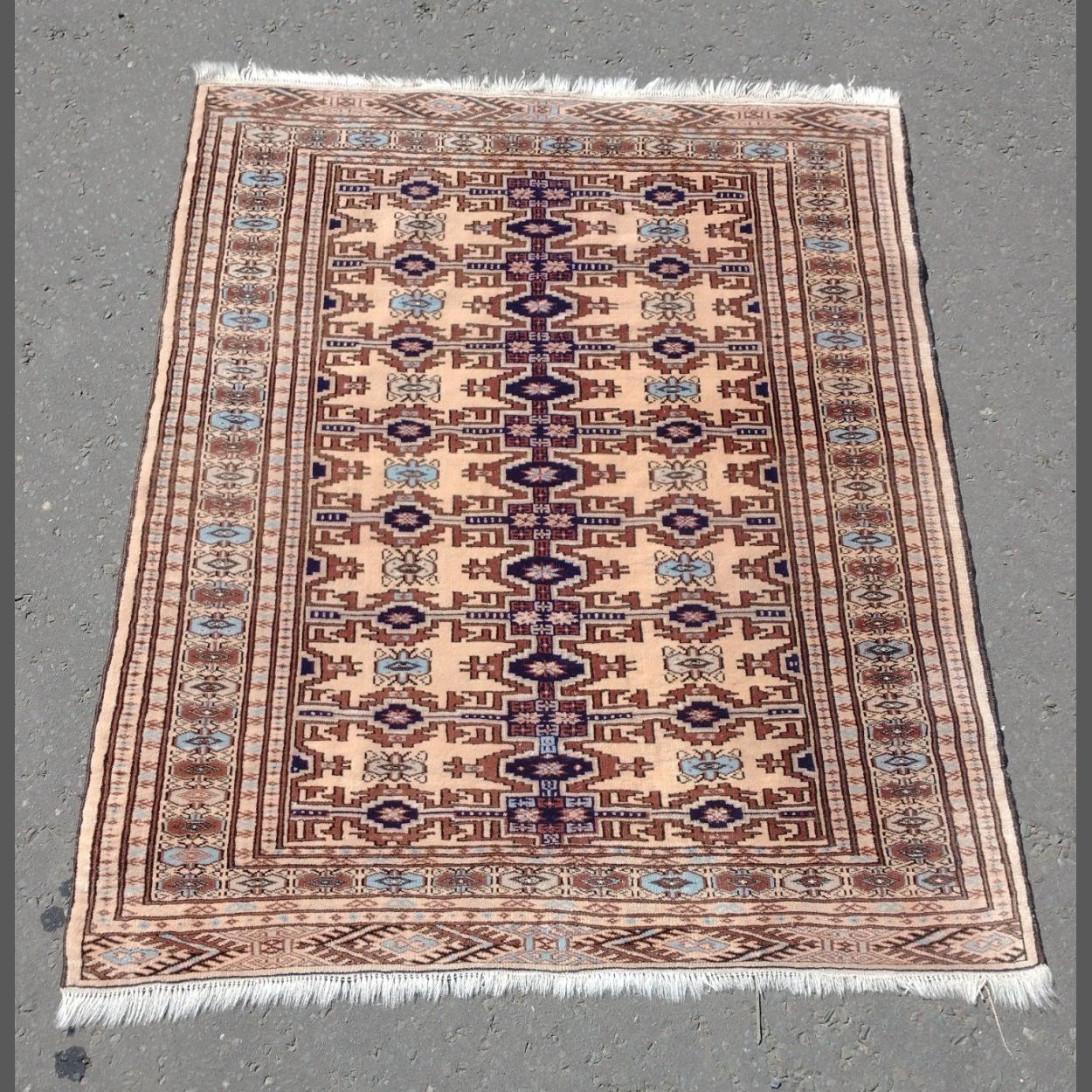 QUALITY PERSIAN RUG 149 x 119cm with a camel coloured background with navy blue medallions, a design to fit in with modern styles.