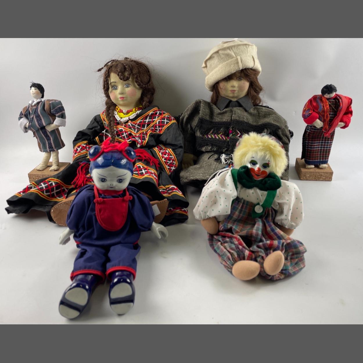 Some beautiful dolls to include a pair of ethnic dolls each approx 50 cm tall with hand-painted faces plus 2 with china faces (1 a clown) each approx. 30cm tall and finally 2 oriental figures on stands approx. 22cm tall