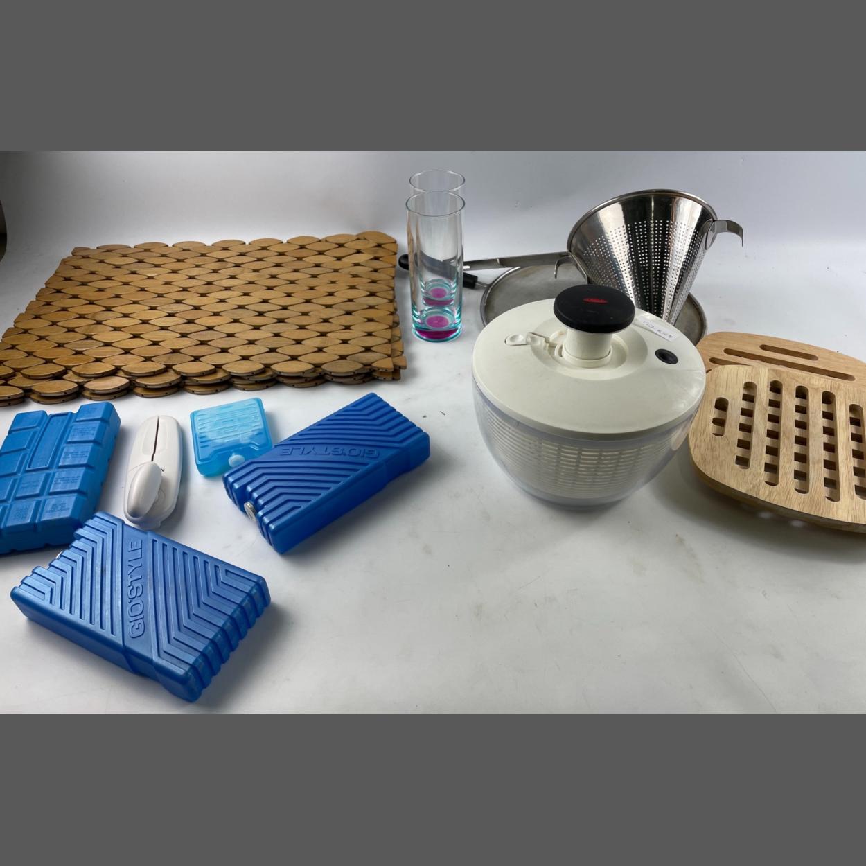 MIXED KITCHEN box to include new saucepan splashguard, cone stainer, mats, salad spinner etc.