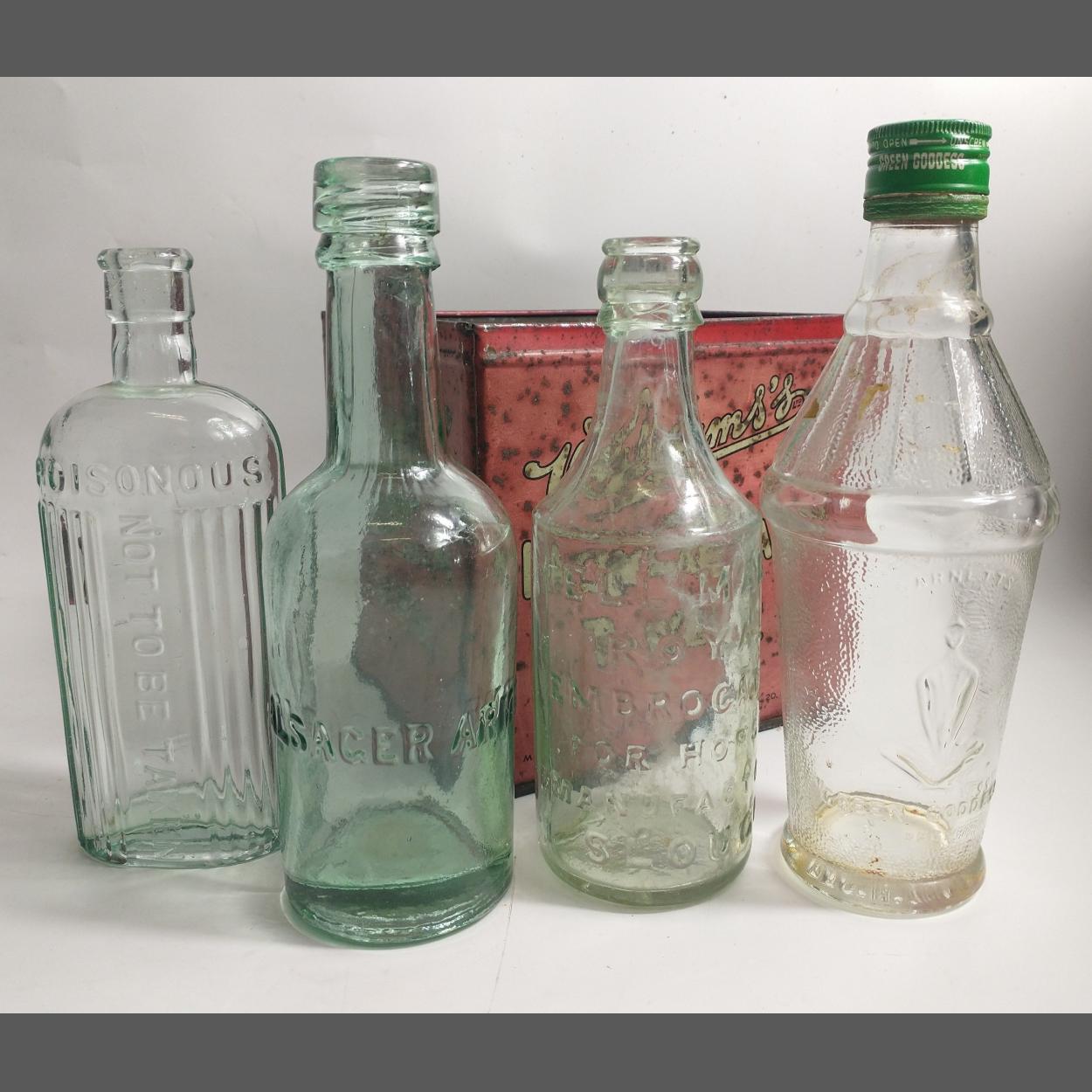 FOUR VINTAGE glass bottles - "ELLIMAN'S ROYAL EMBROCATION FOR HORSES MANUFACTORY SLOUGH", "POISONOUS, NOT TO BE TAKEN", "GARNETTS GREEN GODDESS", "ALSAGER ARMS" plus a VINTAGE 8lbs "William's New Cream Toffee" tin, (16 x 16cm) with lid.