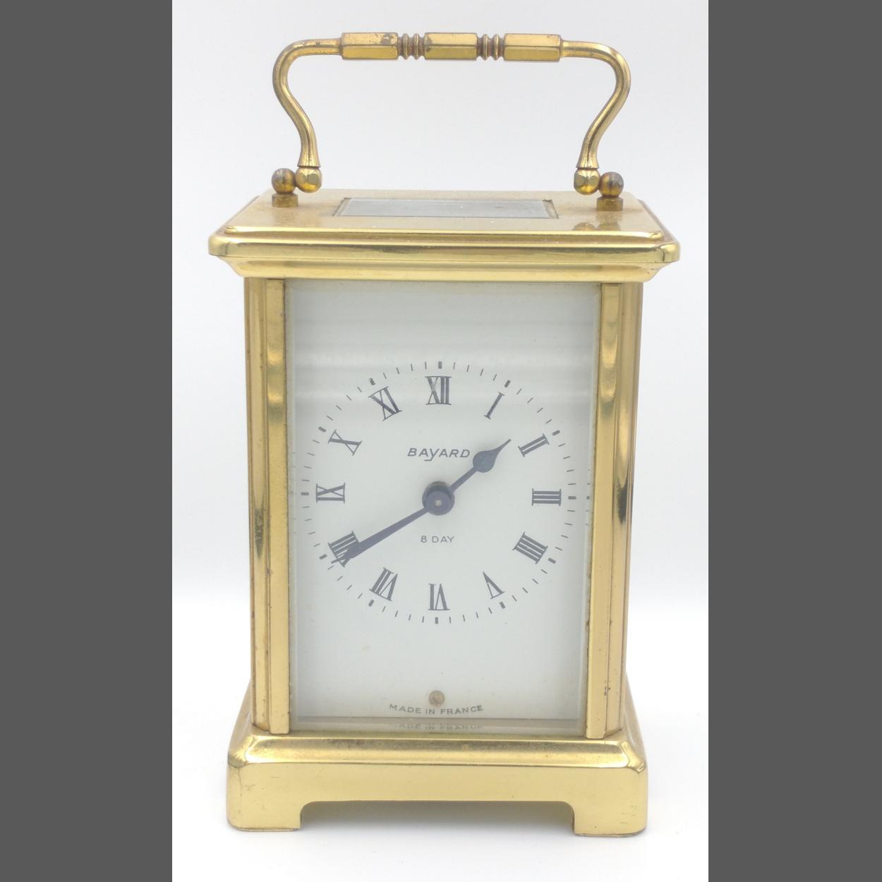 An old DUVERDREY & BLOQUEL of FRANCE 8 day wind-up movement and BAYARD Roman Numeral faced small brass carriage clock with 3 glass sides and partial glass roof which ‘ gives you a view of the mechanism!