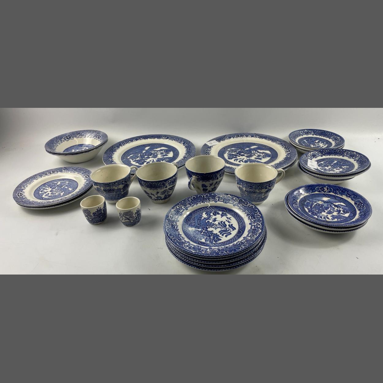 BLUE AND WHITE CHINA - a part dinner set of 4 BARRATTS OF STAFFORDSHIRE dinner plates, 2 x 17cm side plates, 2 x 7cm saucers, 5 cereal bowls and 1 small bowl approx 15cm plus 5 x 17cm OLD WILLOW side plates, 3 saucers and 3 saucers with no label, 2 pairs of teacups with no labels and 2 eggcups.