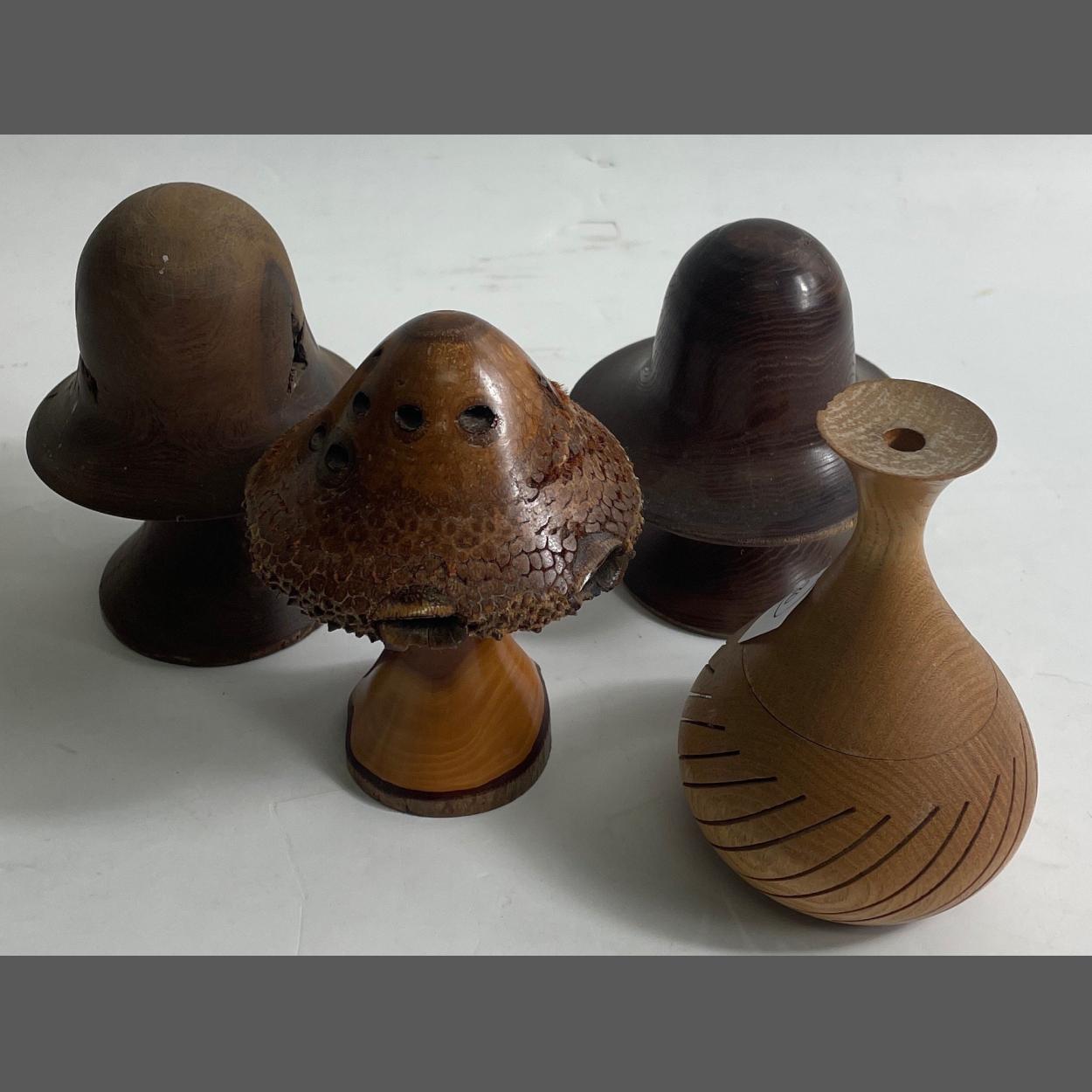A TONY PAGE WOODTURNER on yew wood carved TOADSTOOL / SO BEAUTIFUL with a treen handmade posy vase 1-cm high plus 2 further carved wooden toadstools.