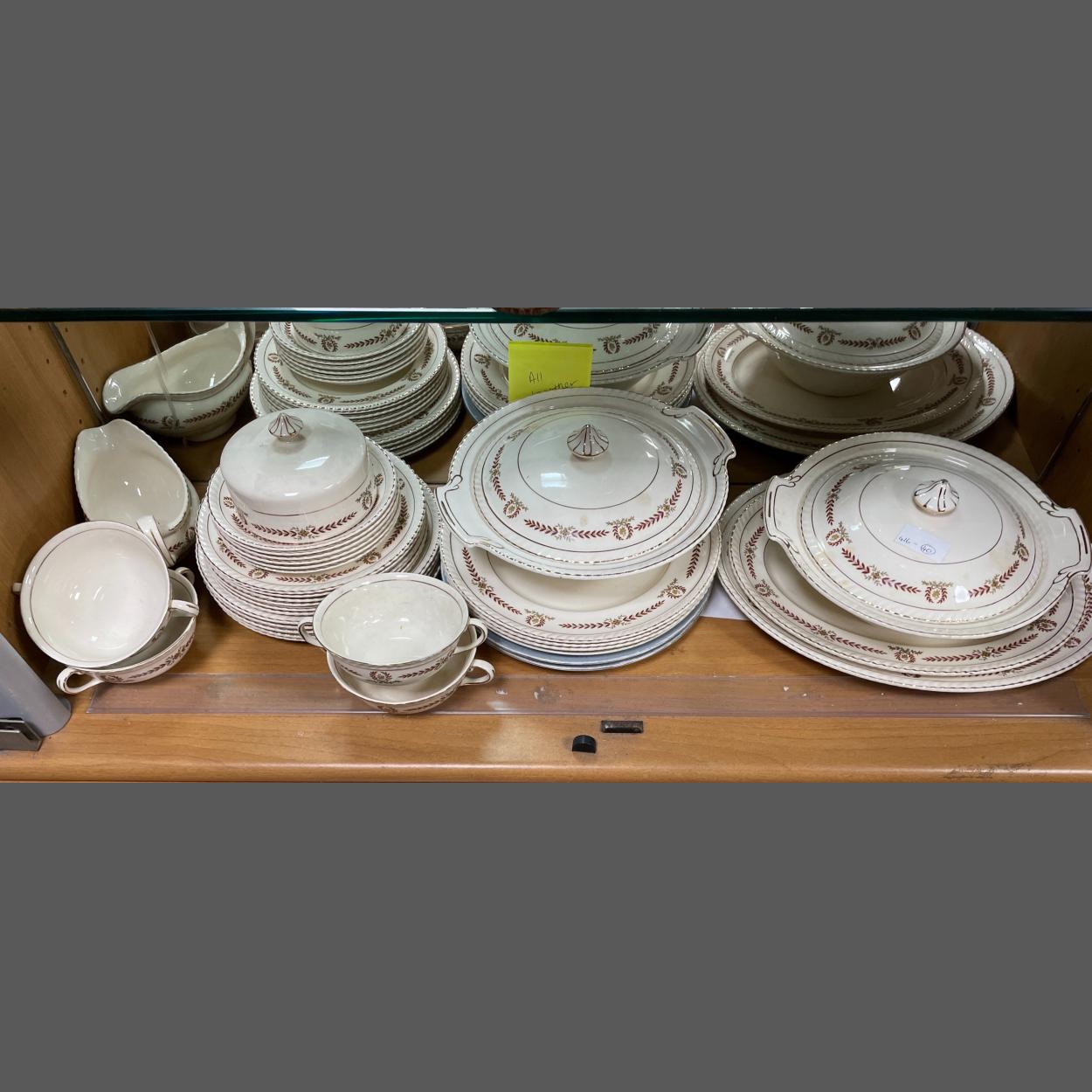 JOHNSON BROS part dinner service to include 3 x 26cm, 5 x 23cm plates, 6 x 20cm plates, 6 saucers, 4 twin-handled soup bowls, 1 sauce boat 2 covered vegetable dishes 2 ashets etc. Mostly in good condition with some slight crackling on one or 2 plates.