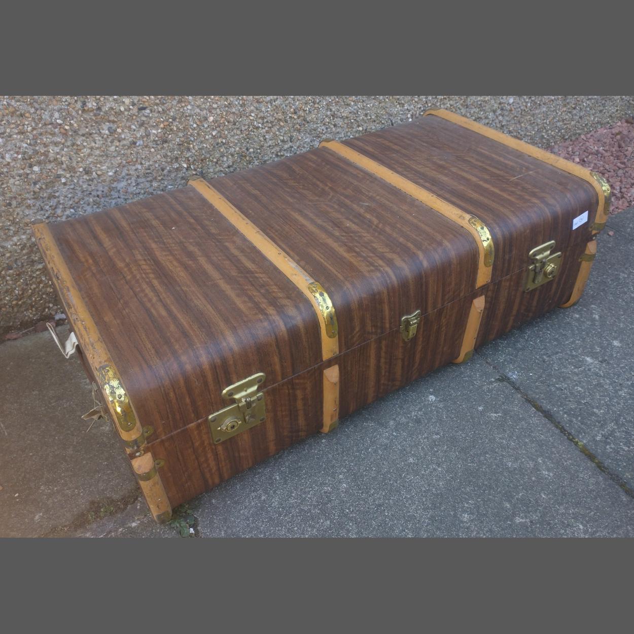 A nice circa 1920's travelling trunk with protective bentwood straps and a nice wooden outer skin effect