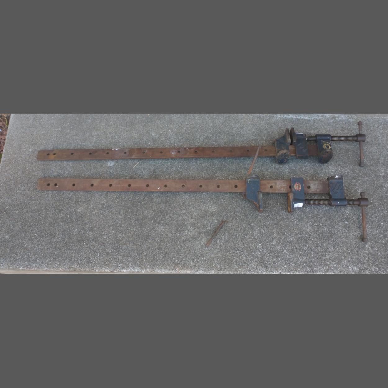 A PAIR OF WOODEN circa 1950's? maker bench clamps 90cm long - lovely condition ( stored up in a loft for 40 years