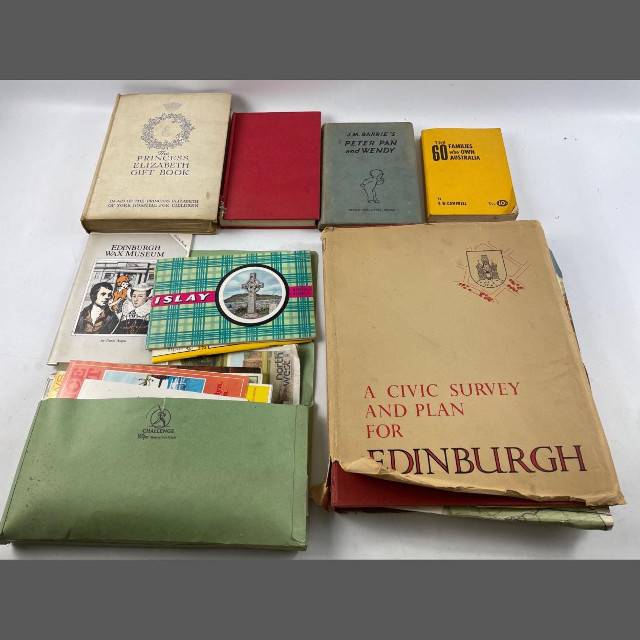 A box FULL OF QUALITY A large VINTAGE book ‘ CIVIC SURVEY AND PLAN FOR EDINBURGH' to include also THE PRINCESS ELIZABETH GIFT BOOK circa 1937 and also The 60 Families who own Australia book, PETER PAN AND WENDY BY JM BARRIE book and LASSIE COME HOME BY ERIC KNIGHT AND A FOLDER FULL OF OLD MAPS ETC