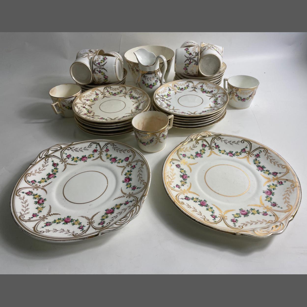 Vintage TEA SERVICE in a floral design with gold trim to include 12 side plates @ 18cm, 11 saucers @ 14 cm, 11 teacups (1 with slight crack), 2 cake plates, 1 milk jug, 1 x 15cm bowl (with a slight crack)