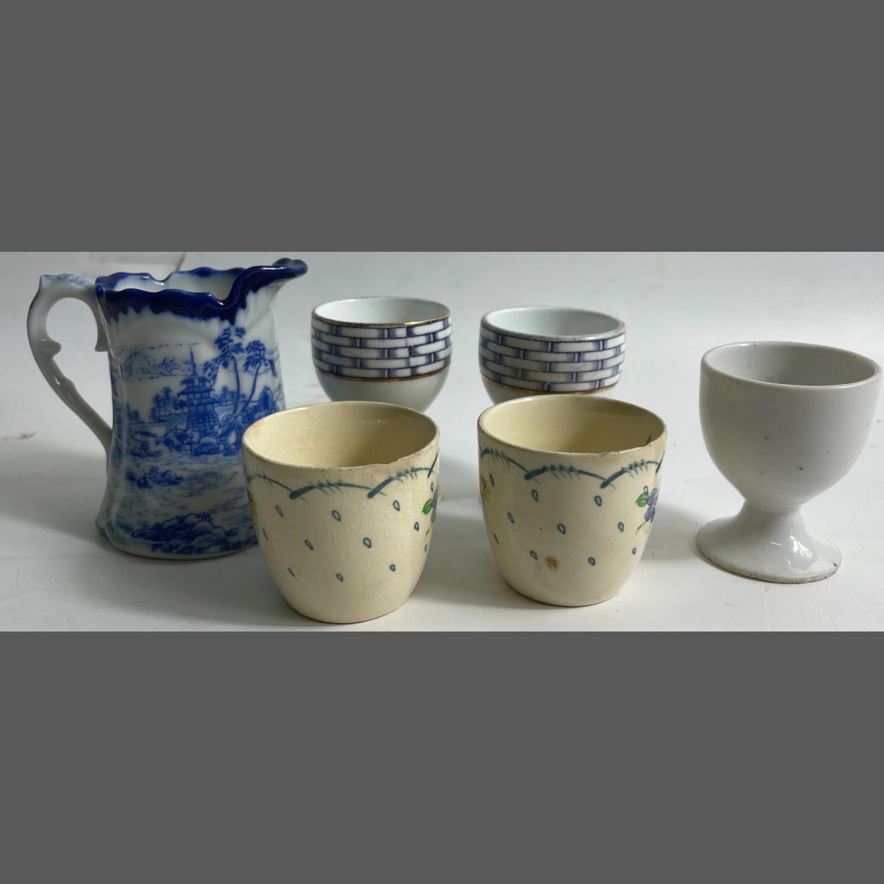 Cheer up your breakfast table with these vintage eggcups - 2 floral stemless cups stamped SUSIE COOPER PRODUCTION CROWN WORKS, BURSLEM (small chip on rims) , 2 cups with stems in a basketweave pattern stamped ROYAL STAFFORD, GUARANTEED ENGLISH BONE CHINA, (1 with slight crack which does not detract from the item), plus 1 other egg cup and a small blue and white jug with a pagoda pattern