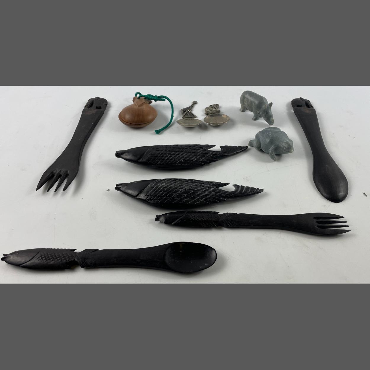 A nice mixed lot of HAND-CARVED WOODEN AFRICAN serving spoons and eating implements, 1 set of eating spoon and fork, pair of hand-carved wooden fish 1 set of serving spoon and fork, 2 TEA CADDY SPOONS from VICTORIA FALLS, one with an elephant and 1 with a giraffe, both with an engraved clock set to 4 o'clock plus a rhino and a frog both carved from stone etc.