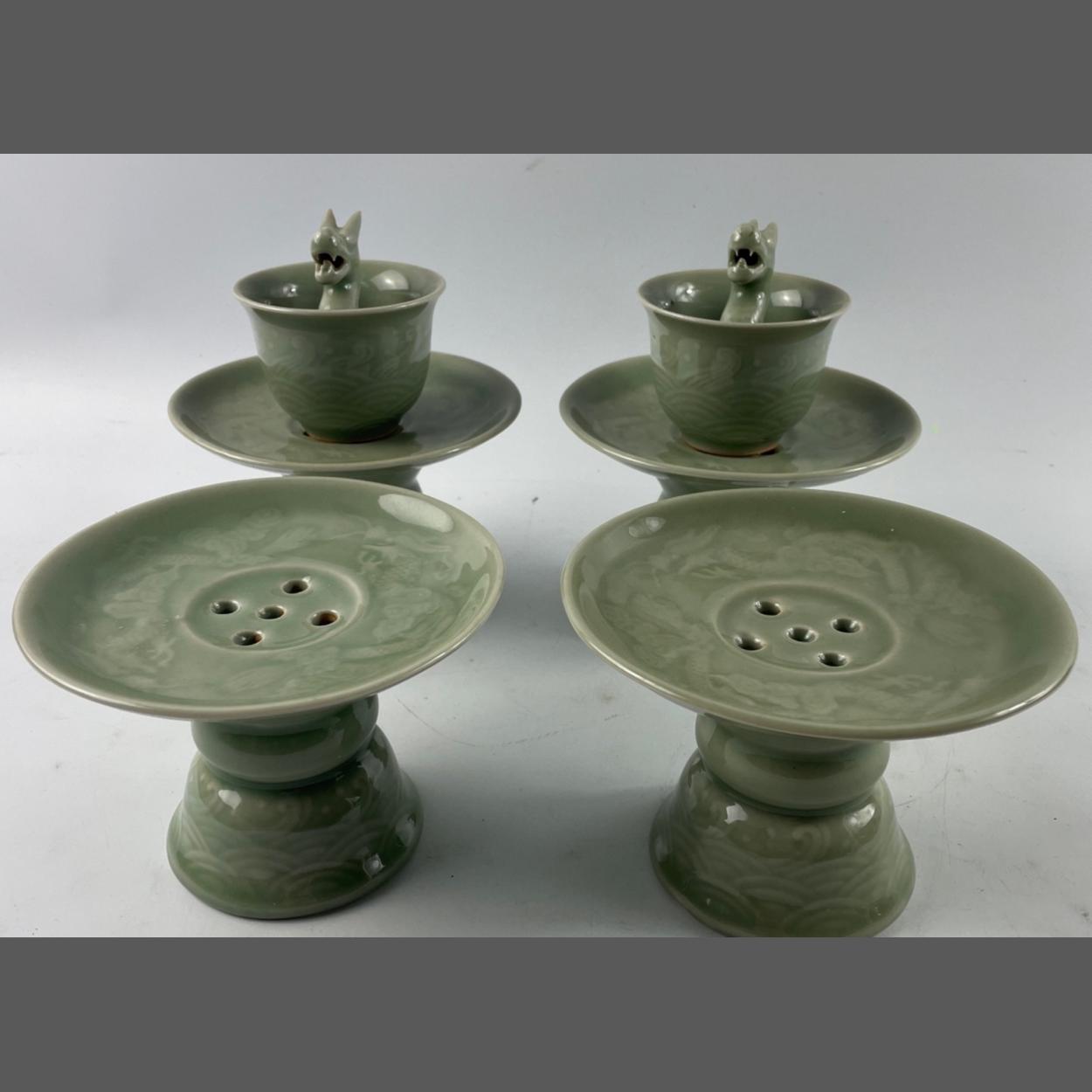 MOST UNUSUAL CHINESE CELADON PUZZLE CUPS or justice cups. Four bases each approx 10cm high plus 2 dragon cups approx 8cm high. Great entertainment value at parties!