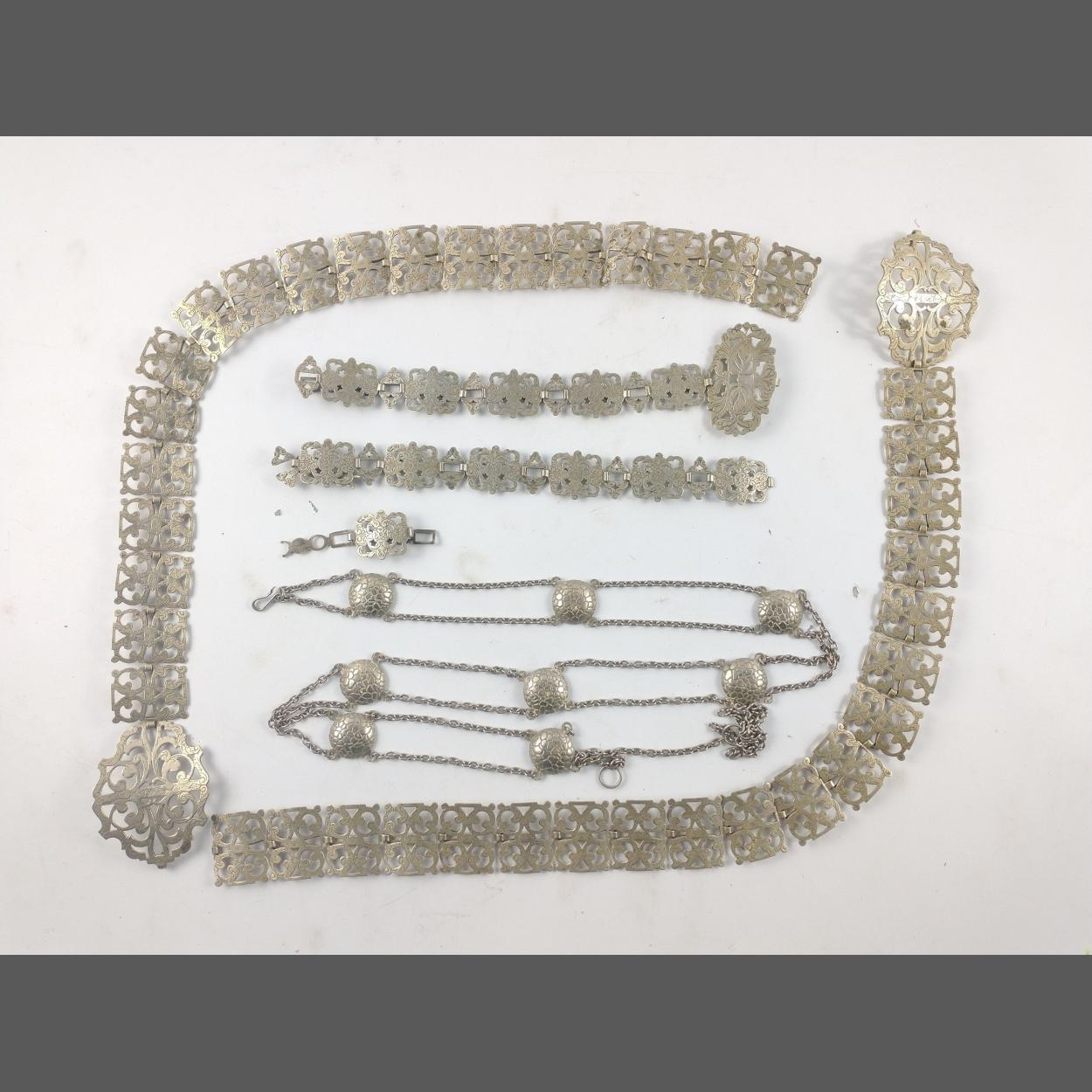 A collection of unusual EPNS JEWELLERY to include 2 belts ( each approx 64cm), a necklace (90cm approx), a bracelet (30cm approx), and another (approx 27cm),