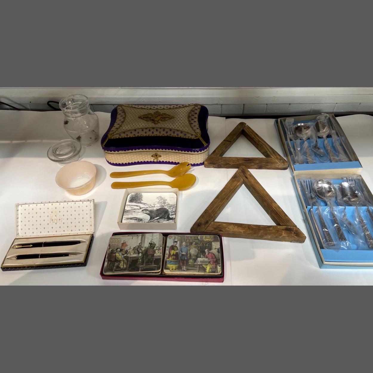A MIXED box to include LADY CLARE coasters, 2 x 7 piece unused cutlery sets, a Parker fountain pen and mechanical pencil set (pencil damaged), 2 wooden trivets, a small jug etc.