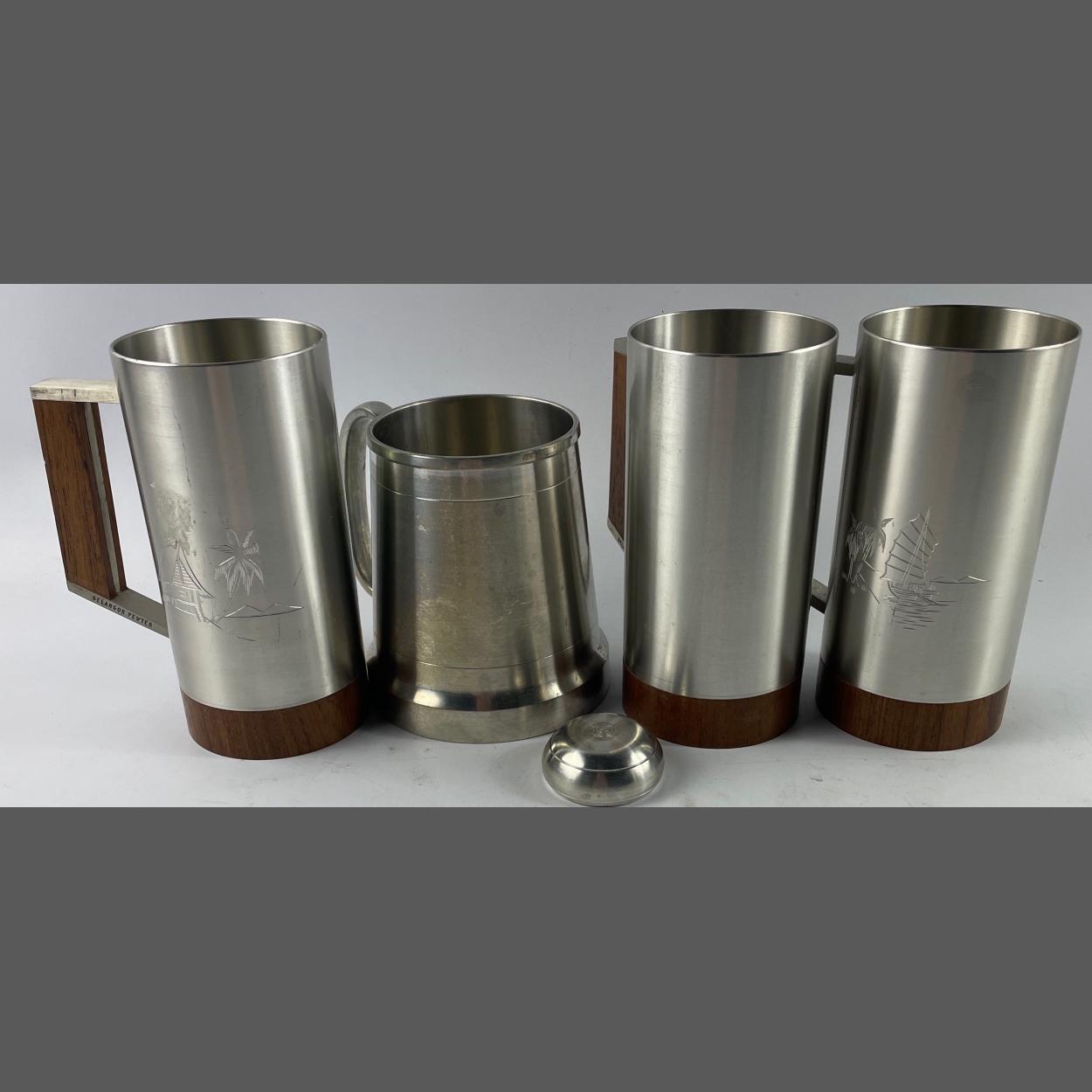TOP QUALITY - Three SELANGOR PEWTER MUGS from Malaysia, one with engraving of a junk and palm tree, one with a traditional Malay house and palm tree and one plain. Each has a wooden base, plus a SELANGOR PEWTER tankard and small salt dish 4.5cm dis.