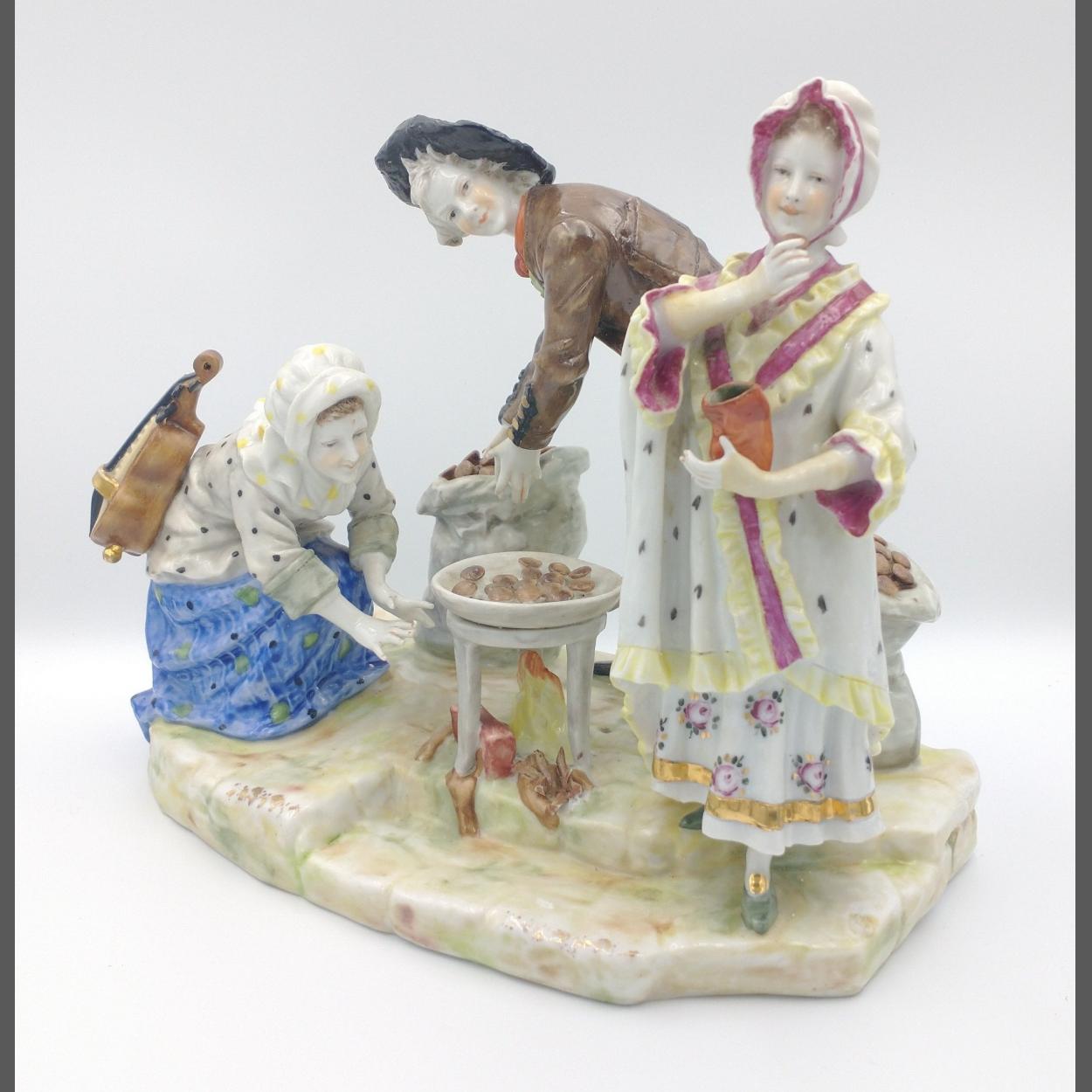 STUNNING QUALITY three figure group in the style of FURSTENBERG roasting chestnuts, maker's mark indistinct.