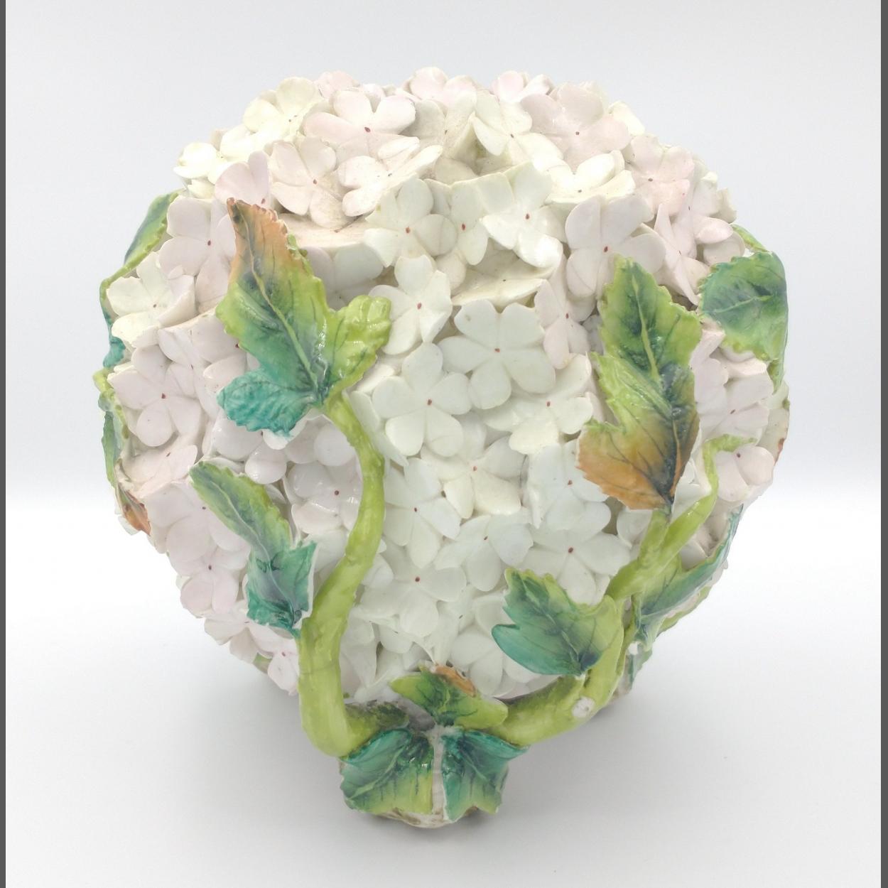 EXTRAORDINARY CRAFTMANSHIP - Victorian MOORE BROS 'Depose' ball vase with floral encrusted outer supported by 3 plant form feet and a diamond shaped design registration mark to base, stands approx. 12cm tall. Very slight damage to some of the leaves but does not detract from the item.