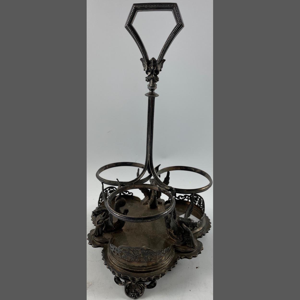 WINE BOTTLE HOLDER - heavyweight holder for 3 bottles with a design of dragons, stands 38cm approx. stamped Walker & Hall 1477, nice quality.