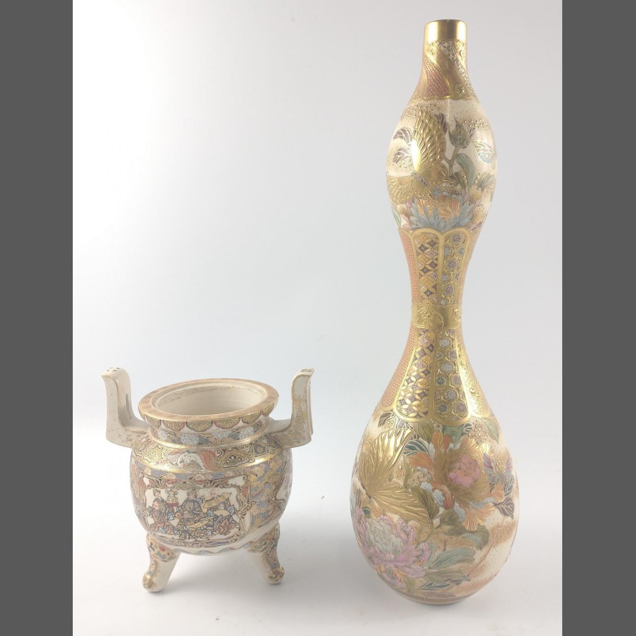 A tall (40cm approx) narrow-necked ORIENTAL vase heavily decorated with gold-embossed butterflies and a separate pot (14cm high) again heavily decorated with gold and a design of Oriental people enjoying a music session.