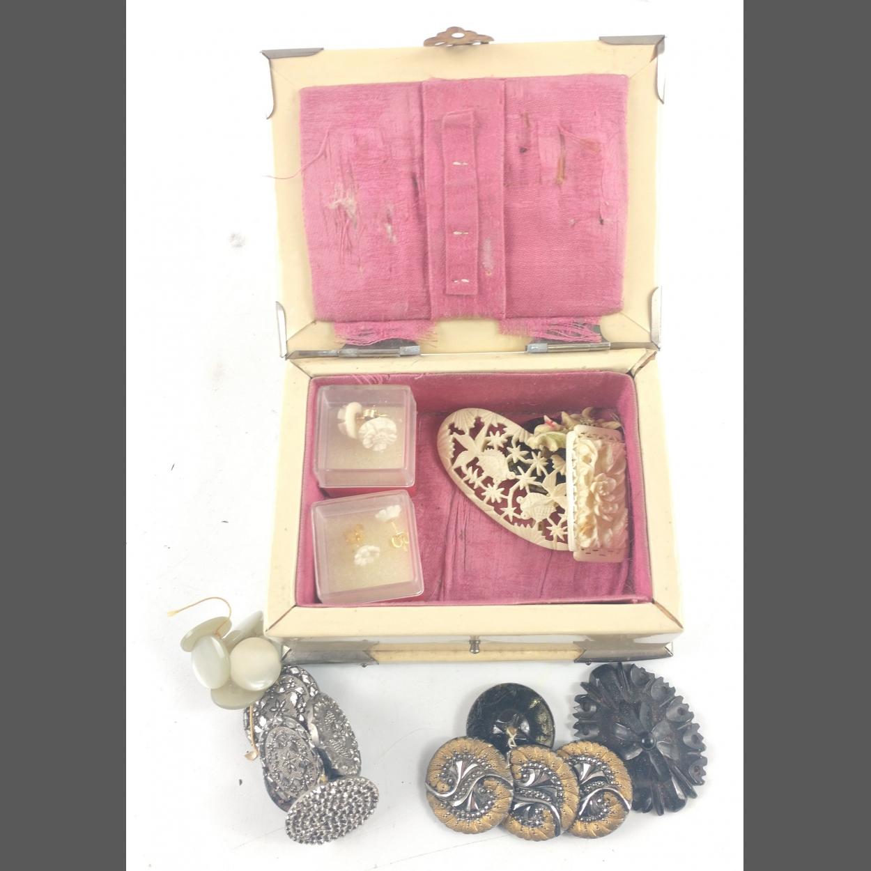 Small sewing box containing two bone style carved brooches, 2 pairs of floral carved earings and set of fancy buttons.
