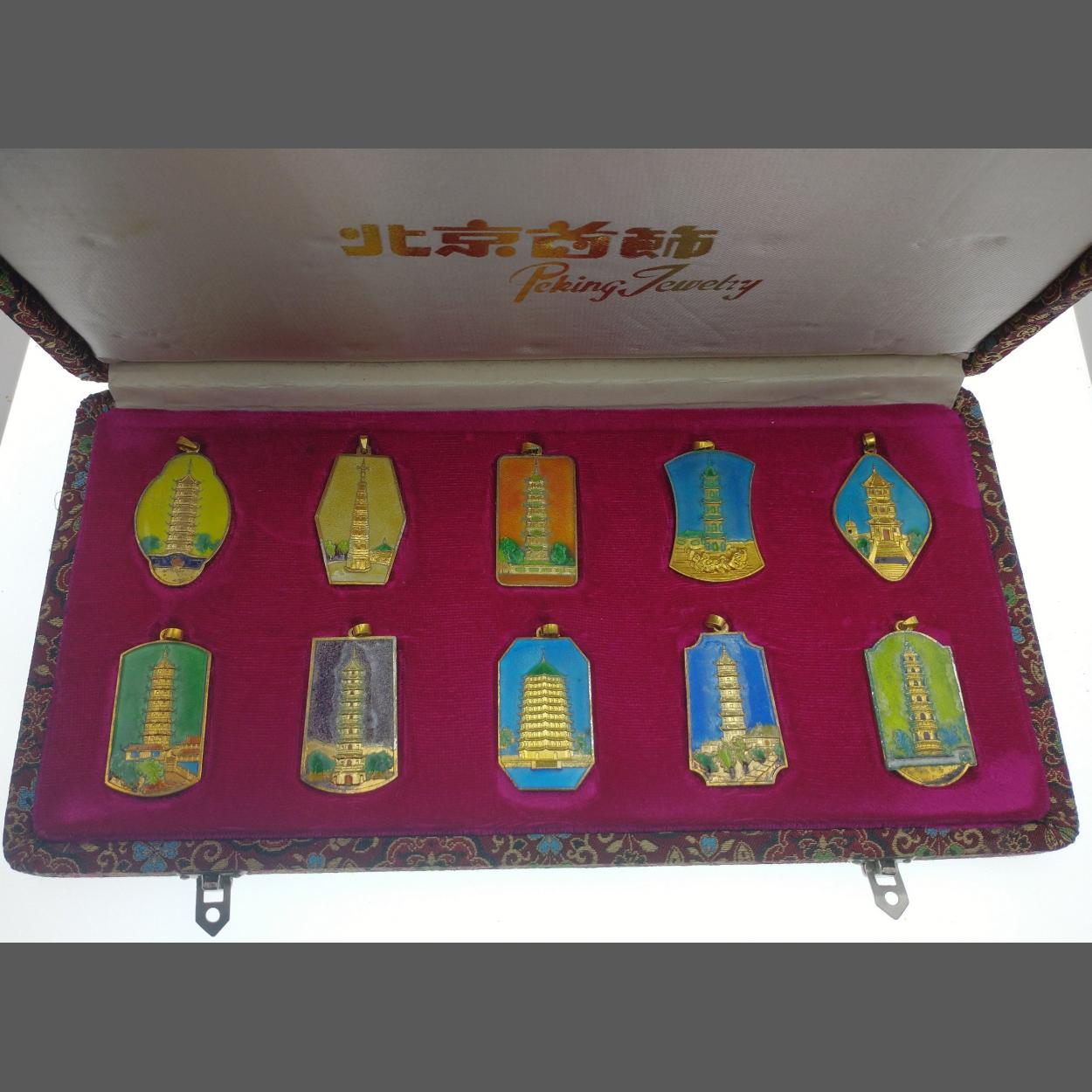 Presentation box containing 10 ENAMELLED pendants depicting PAGODAS [ 4cm x 2.5cm each approx]