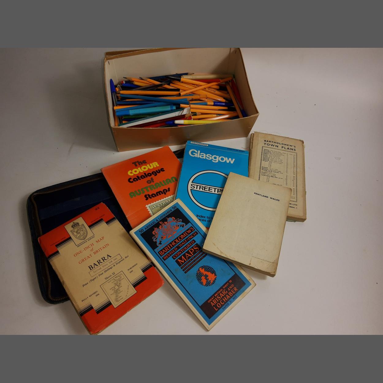 Large box of pens, pencils etc along with some vintage maps and a well-used blue leather writing case.