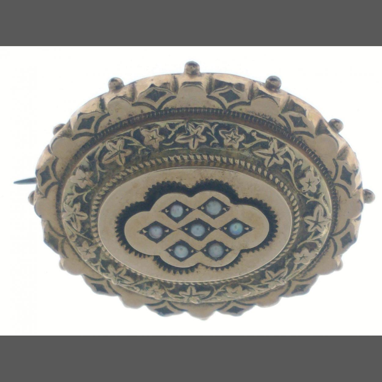 Vintage 'yellow metal' oval shaped mourning brooch set with 7 seed pearls