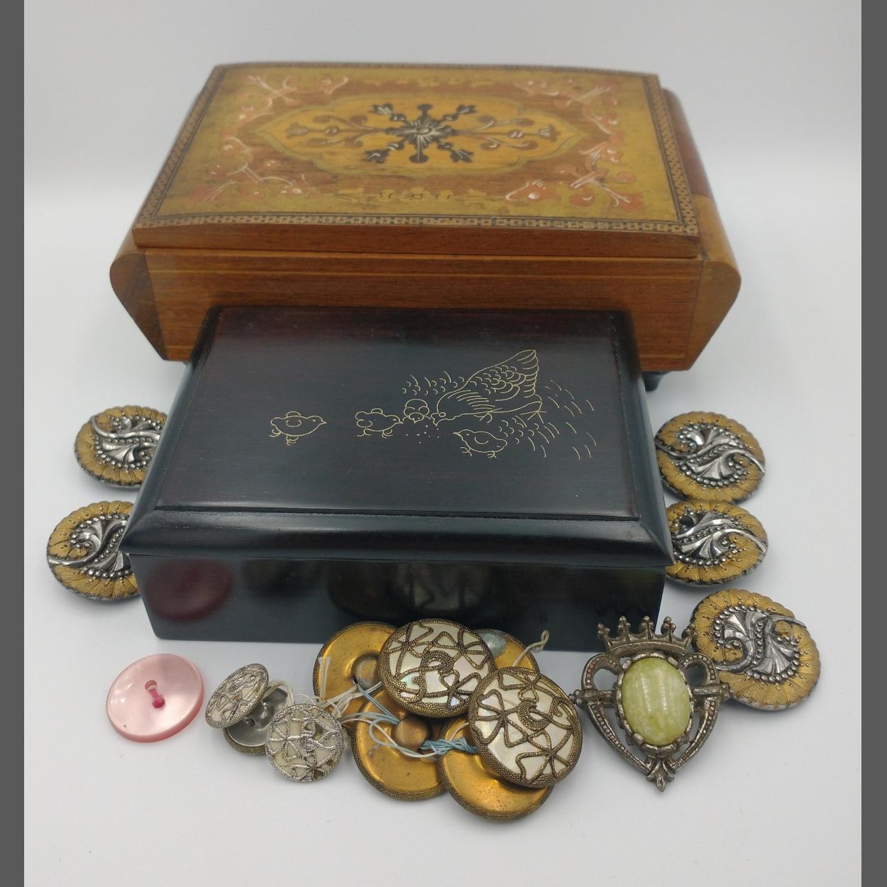 Small Bakelite style trinket box with HEN and CHICKS engraved on lid and Wooden music box [not working]