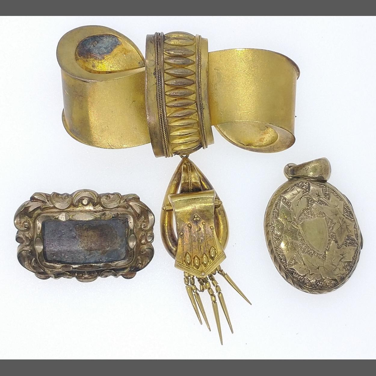 2 Vintage yellow metal booches and a yellow metal oval engraved locket