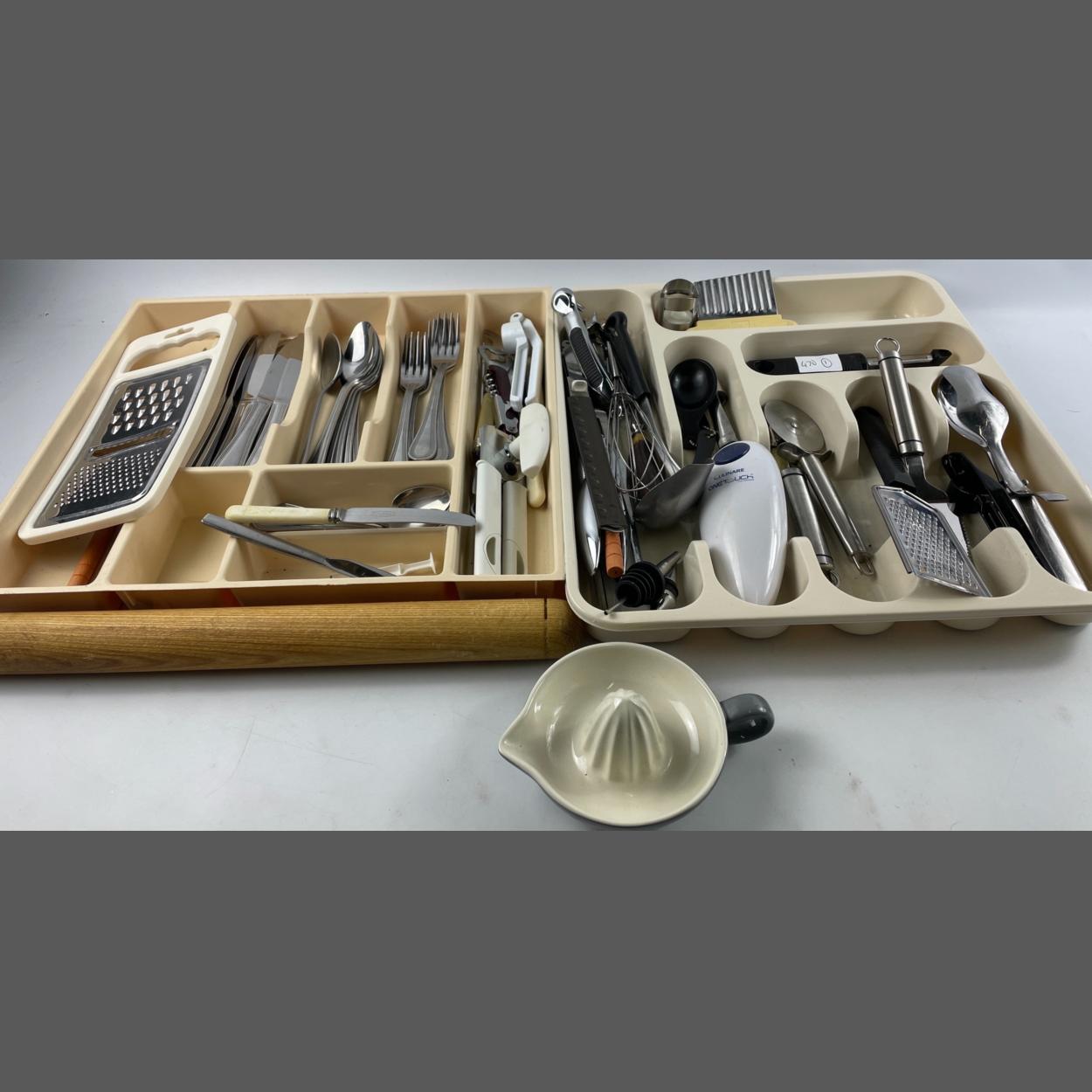 Two trays of really nice cutlery and kitchen utensils etc