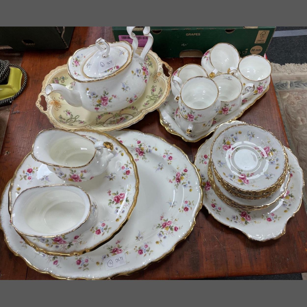ROYAL ALBERT TENDERNESS teaset to include a very large sandwich plate, large teapot, 6 cups(1 damage repaired) saucers side plates, kind cake plate 30cm long x 16cm wide, a nice COMPORTE 23cm diameter, sugar and cream, and a separate med sized vintage plate by MILTON 34cm long