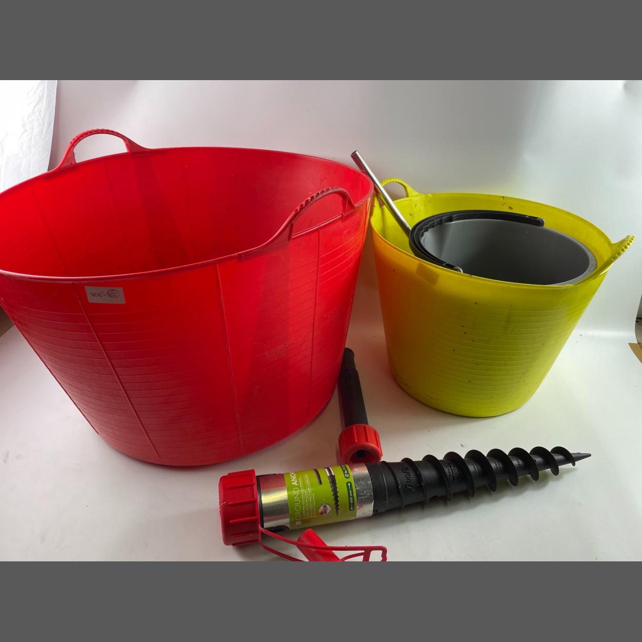 The DOMESTIC LOT - a gound anchor for rotary clotheslines etc, a bucket and 2 FLEXI TUBS 1@ 35cm approx, the other 65cm approx.