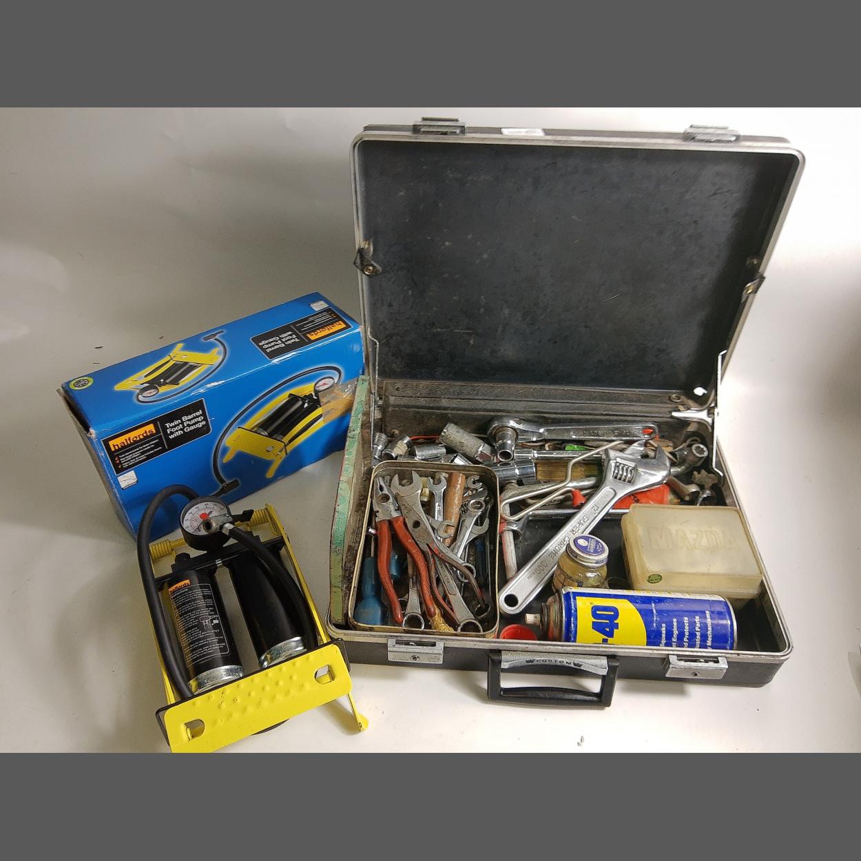 A DIY TOOLKIT contained within an old briefcase, contents include light bulbs for a MAZDA, spanners, pliers etc. also a HALFORDS twin barrel foot pump with gauge.
