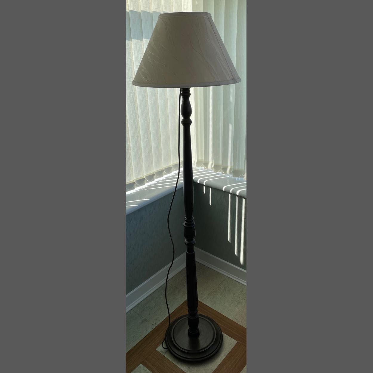 Two floor lamps one angular in brass finish with shade the other in turned wood with cream shade both around 5.5ft tall approx