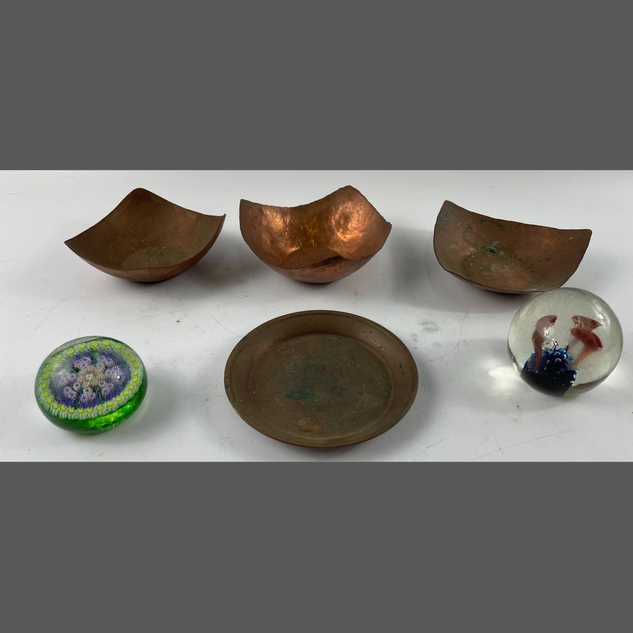 FOUR COPPER DISHES (largest approx 1cm dia) plus 2 paperweights