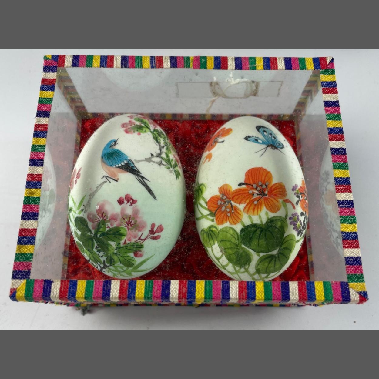 RATHER UNUSUAL - Two hand-painted eggs in a presentation case, a gift from the East.