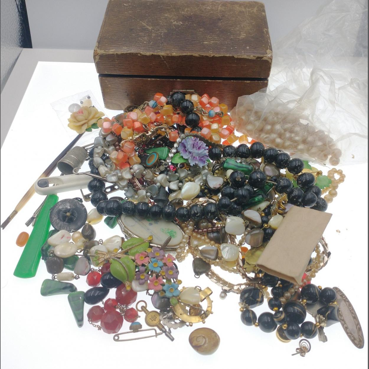 Small jewellery box with contents 16 x 10 x 6cm approx, plus a bag of mixed costume jewellery.